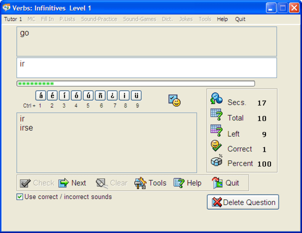 The program’s interface will be a blessing to computer users of all skill levels. With simple icons that do a good job of describing their function, users need only hold the cursor over each for a more in-depth description to pop up. A Help file is also available, which focuses on program functions and not Spanish language. Users begin by choosing what level of competency they are at with three level buttons. From here, users can choose from a range of icons across the top for tools like Listening Comprehension (a voice repeats letters and words for users to hear), Dictation (users hear a word and must write it down), and a Spanish-to-English dictionary.