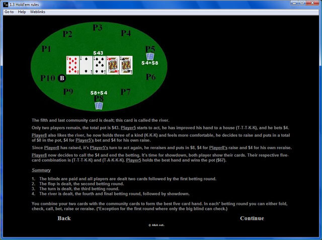 This software is made for beginners and players who want to improve their basic knowledge in low-limit and loose high-limit Hold’em poker, developed in cooperation with Texas Hold’em online professionals. From the SW interface you choose among different topics to read and learn. Includes rules, definition of hands, position, starting hands, betting, bluffing, drawing hands, pot odds, flop play, turn play, river play, draw odds, short handed games, bankroll, and advancing.